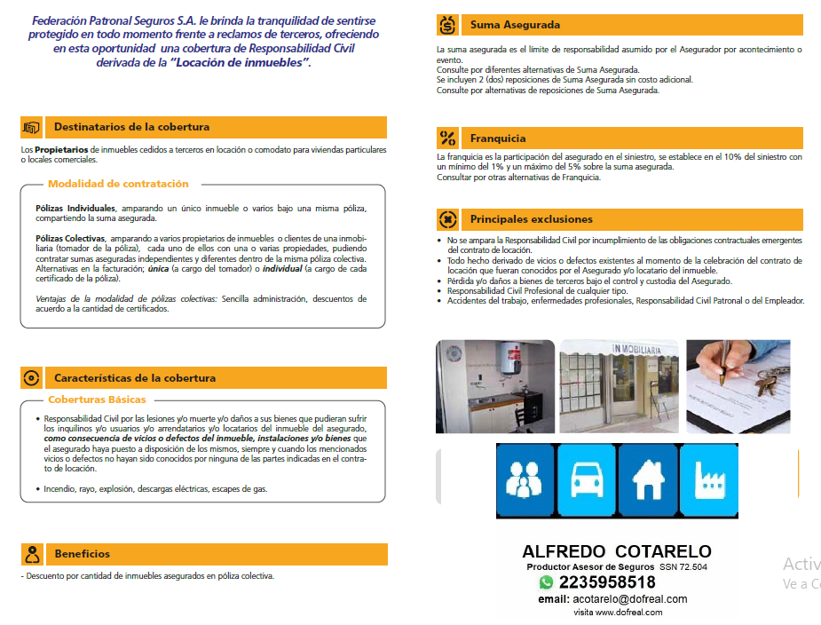 Con este instrumento se cubrirían los daños que pudiera sufrir su inquilino dentro del inmueble, a consecuencia directa de daños o lesiones ocasionada por la acción de fuego, rayo, explosión, descargas eléctricas, escapes de gas y/o la caída de objetos dentro de la vivienda.
